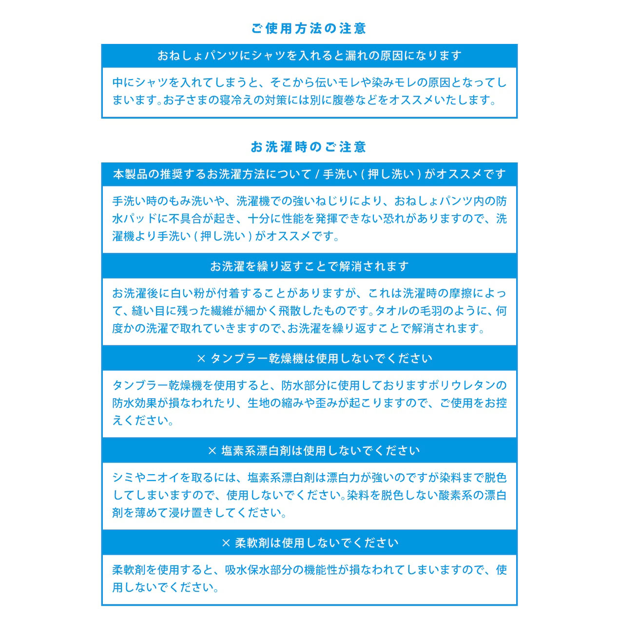 オムツをつけていても毎晩のようにシーツや掛け布団まで濡れてしまい困っていましたが、この商品をオムツの上から着用することで改善されました。オムツから漏れた尿をパンツが吸収してくれて洗濯がグッと楽になりました。結構しっかりした作りでずっしりしていますが、履いている本人は履き心地も特に気にならないようです。難点は乾きにくさです。特に寒い時期は外干しだけだとなかなか乾かないので、室内乾燥機にあてて乾かしています。